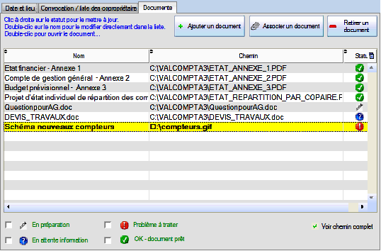 Il ne s'agit évidemment pas d'une gestion très complexe mais simplement d'associer à votre assemblée un certain nombre de fichiers et de documents que vous avez l'intention de présenter (ou simplement que vous utilisez) et d'en faire un suivi jusqu'à la date de l'AG.