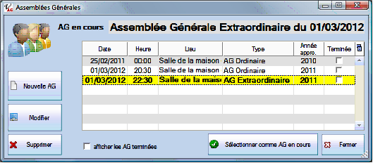 Le programme permet de gérer plusieurs Assemblées et de conserver ainsi l'historique avec le détail des résolutions, de l'émargement, des votes et les documents (convocation, procès-verbal…).